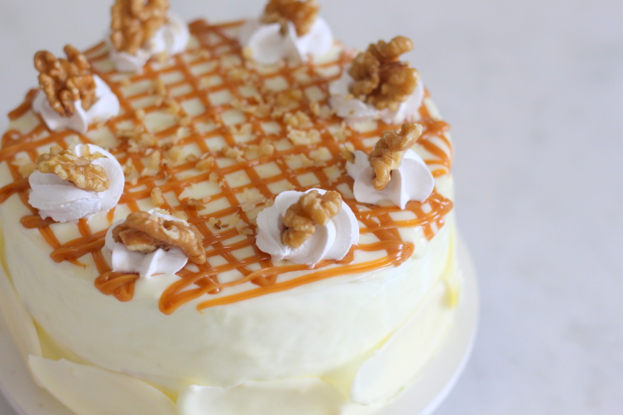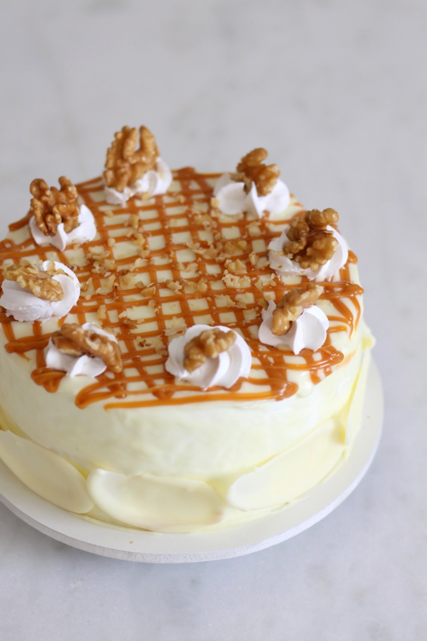 – 1 Bolo com massa de pão de ló de baunilha, molhado com nossa calda especial, mousse de doce de leite, pedaços de nozes picadas, cobertura de chantilly e ganache de chocolate branco.