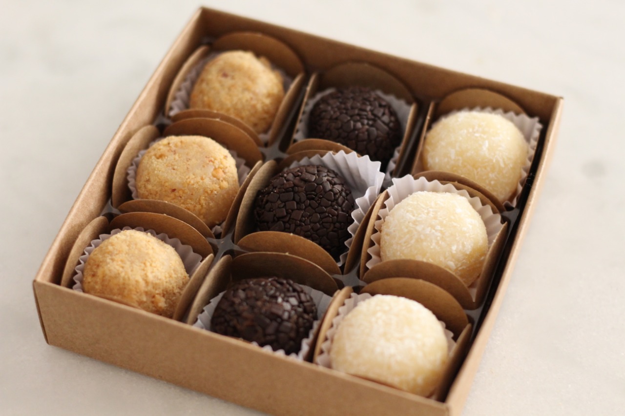 Ingredientes: Brigadeiro de Nutella: Leite condensado, creme de avelã (Nutella), chocolate em pó, manteiga, granulado de chocolate Brigadeiro de Leite Ninho: Leite condensado, leite em pó (Ninho), chocolate branco, açúcar refinado, manteiga. Brigadeiro de Paçoca: Leite condensado, paçoquinha, chocolate branco, manteiga, farelo de paçoquinha.