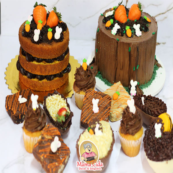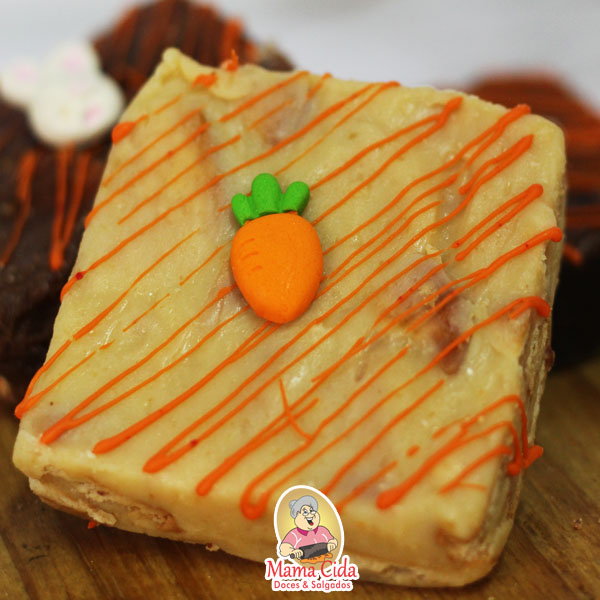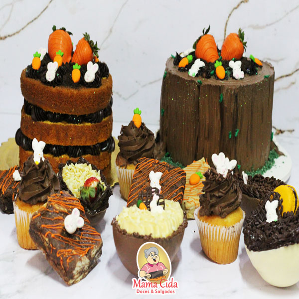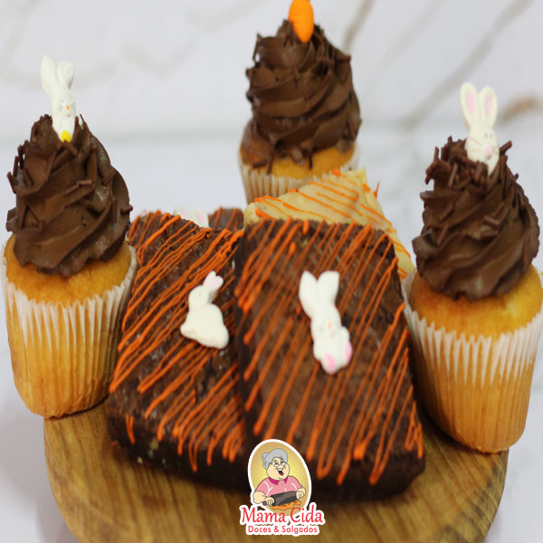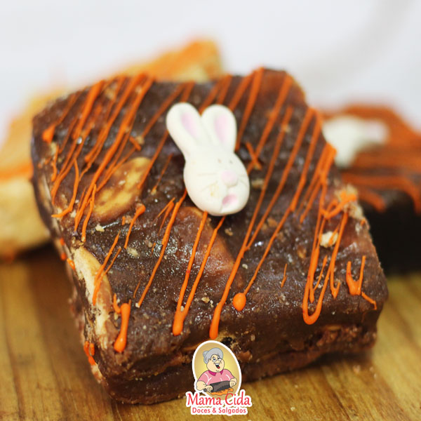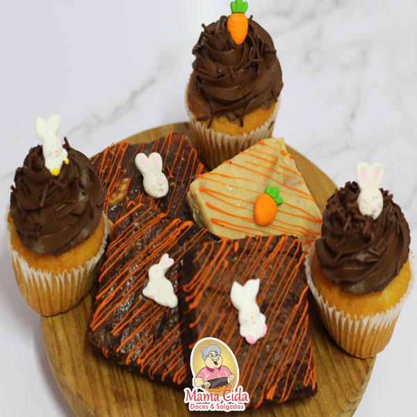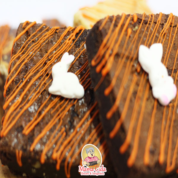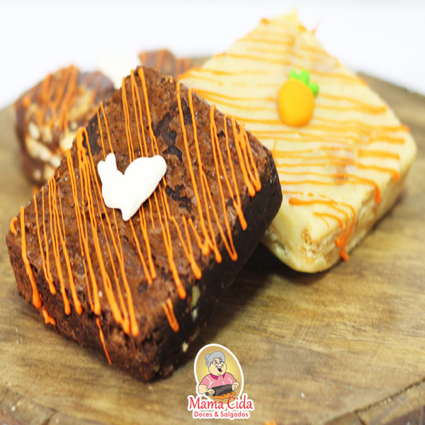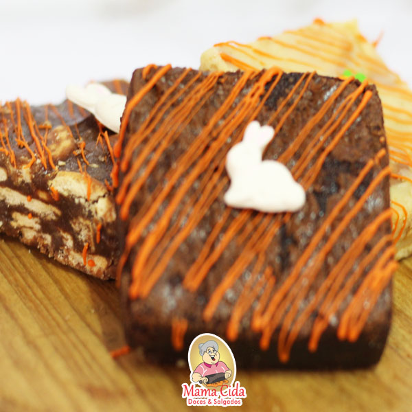 – 1 Caixinha kraft com visor transparente com um brownie ou uma palha italiana com decoração de Páscoa de aproximadamente 60 a 90 gramas