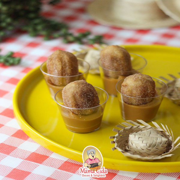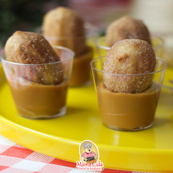 Minii churros com massa crocante, recheado com doce de leite, polvilhado com açúcar e canela e copinho com doce de leite cremoso