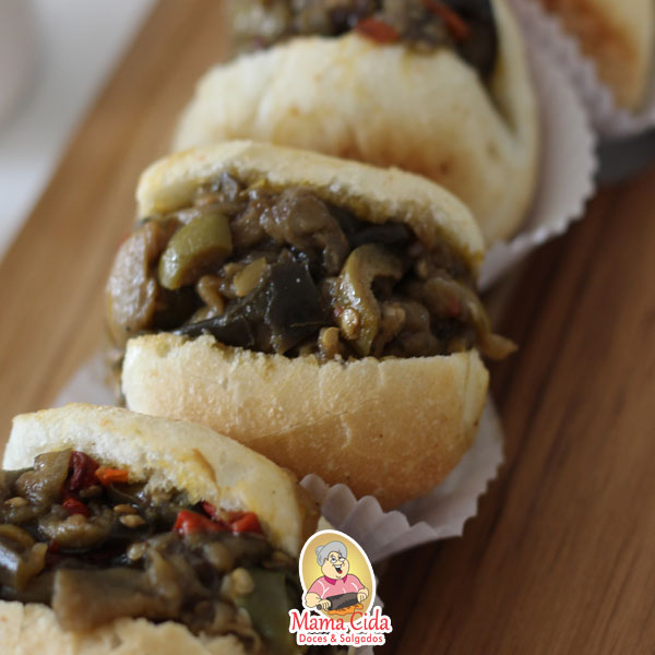 – Lanchinho no mini pão francês ou mini pão de leite ou mini pão de brioche ou mini pão de ciabatta recheado com antepasto de berinjela – mínimo 10 unidade