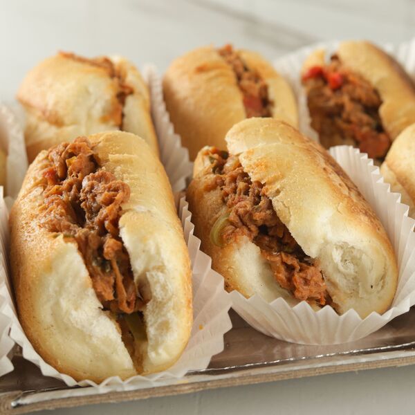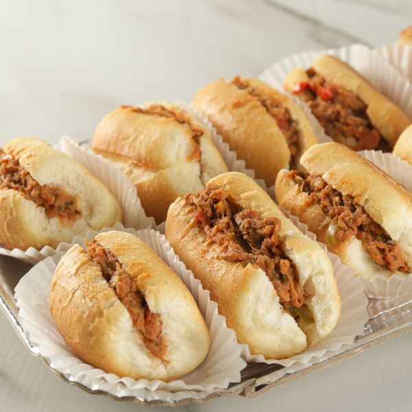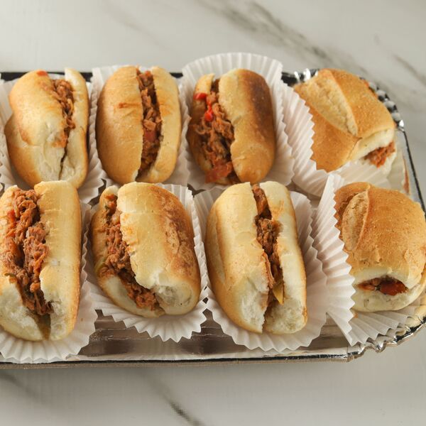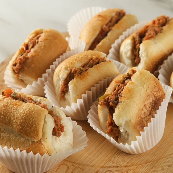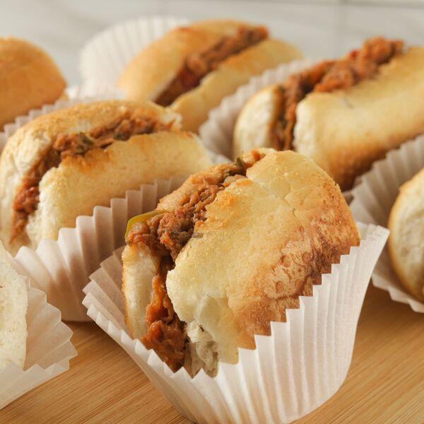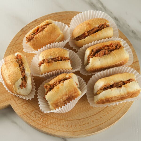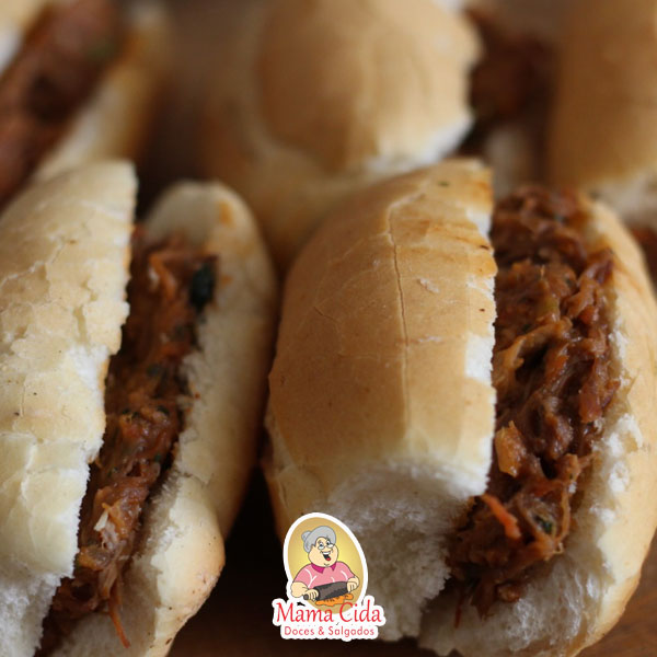 – Carne louca desfiada e temperada com molho no mini pão de leite ou mini francês.