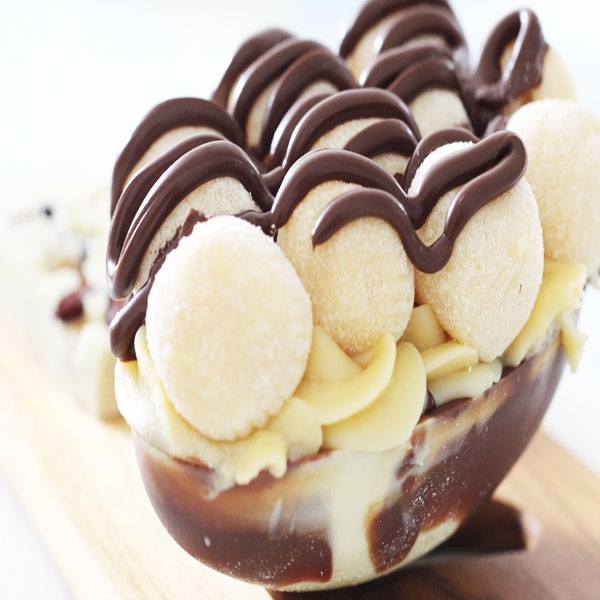 Informação do produto: Casca de chocolate ao leite, brigadeiro cremoso de leite ninho, raspas de chocolate branco