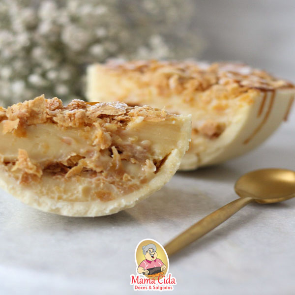 Deliciosa casquinha de chocolate branco, recheada com massa creme e folhada carameliza.