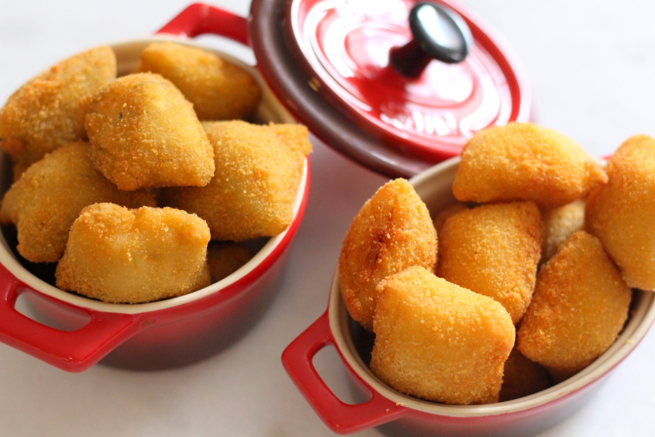 – Risoles feitos com massa de leite, recheadas com alho poró com palmito.