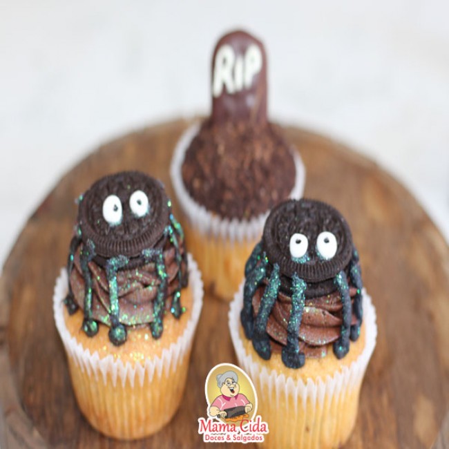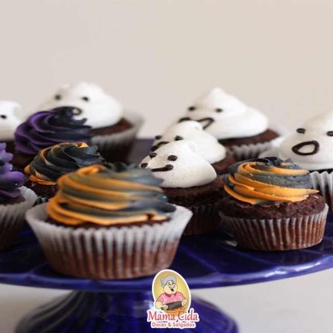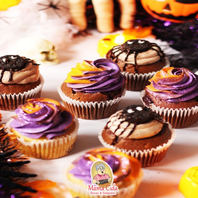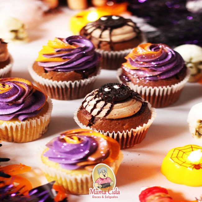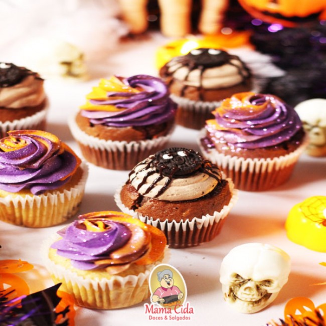 Mínimo de 10 unidades de cupcake tradicional ou mini com massa de sua escolha, cobertura e recheio de sua escolha, com personalização em tema Halloween
