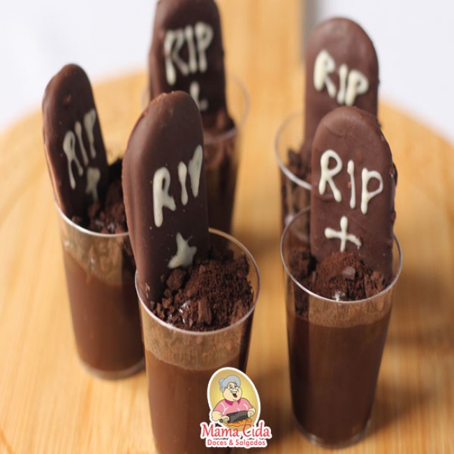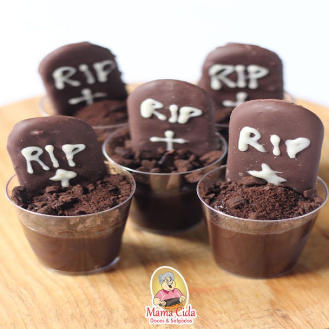 Docinho no copinho sendo brigadeiro ou bicho de pé ou beijinho, personalizada com lapide de bolacha maisena banhada em chocolate, escrito RIP, para festa de Halloween.