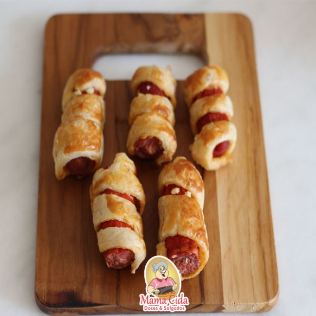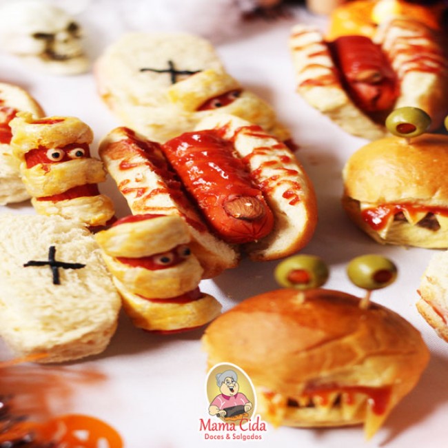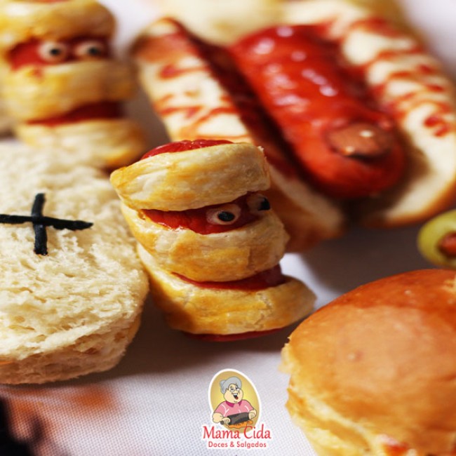 O que você vai levar: Enroladinho de salsicha tematico em formato de múmia com massa folhada 1 embalagem papelão ou isopor, propria para transporte de bolos.