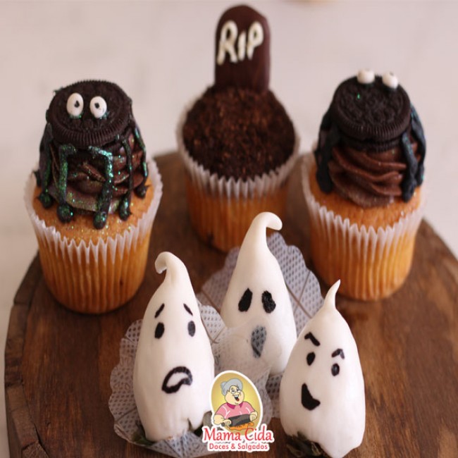 O que você vai levar: Morangos frescos banhados com chocolate branco, personalizado para o Halloween em formato fantasminha. 1 embalagem apropiada para transporte de docinho